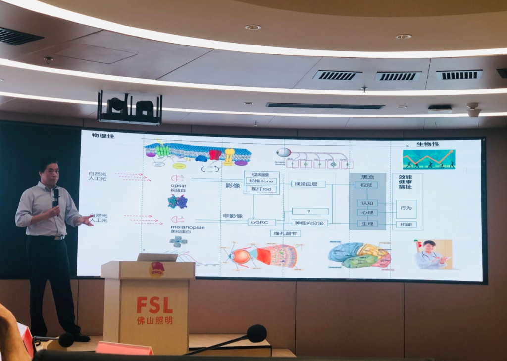 冯昭扬首席研究员接着对人因照明的定义,关联学科在人因照明研究中的定位,成像性视觉及非成像性信号通路的生理、心理效应研究,人因照明研究的挑战等进行了分享。