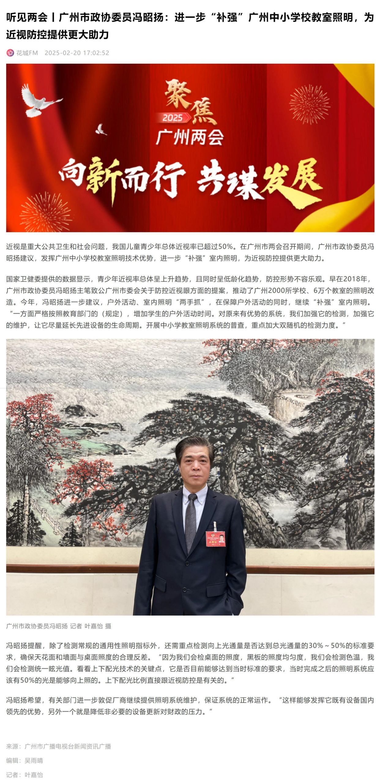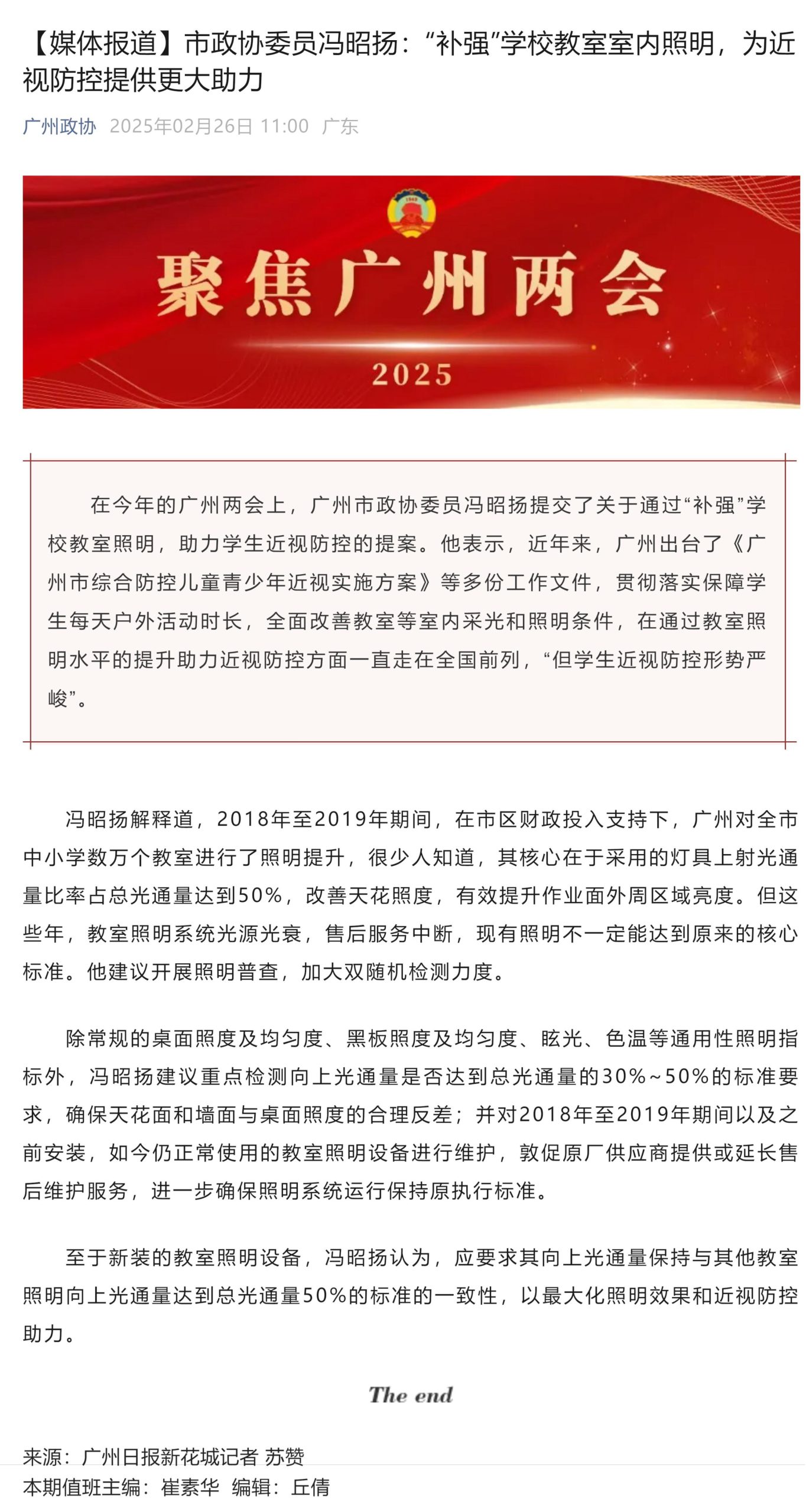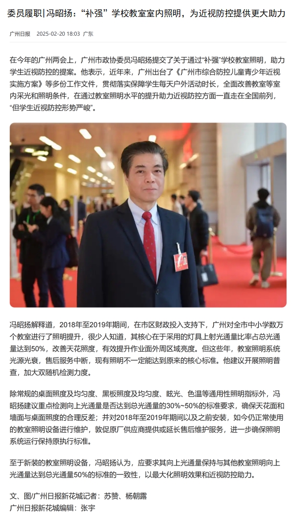 链接:听见两会|广州市政协委员冯昭扬:进一步“补强”广州中小学校教室照明,为近视防控提供更大助力